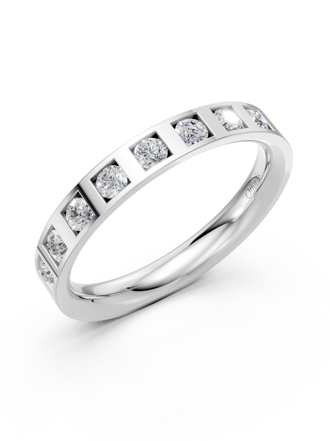 18ct white gold 3.5mm wedding band set with 8 brilliant cut diamonds in square settings. 0.40ct total weight, colour 'F', clarity 'VS'.